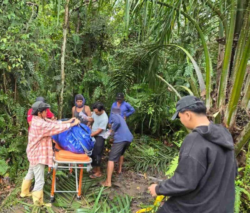 Setelah menyisir area kebun sawit, petugas akhirnya menemukan jasad korban yang berada di antara semak-semak.